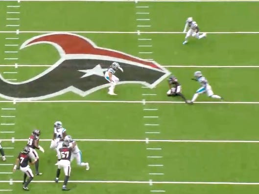 Houston remains in their 11 personnel with an initial 2x2 look that motions to a 3x1 bunch to the weak side. Stroud fakes the action to Chubb, and the linebackers do not bite. Kirk, Hutchinson, and three offensive linemen quickly gather steam upfield. A slight miscue by left guard Tomlinson keeps this from becoming a huge gain.
