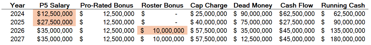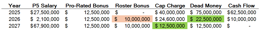 The vesting schedule was rewritten upon implementation of the new contract, providing full guarantee protection for the $10.0 million bonus with a vesting date of January 6, 2026. This date is three days after the contract execution. This date was used to prevent the roster bonus from being treated as “other amounts treated as a signing bonus,” or also known as “OATSB”. This essentially prevents the roster bonus amount from being prorated like a signing bonus.