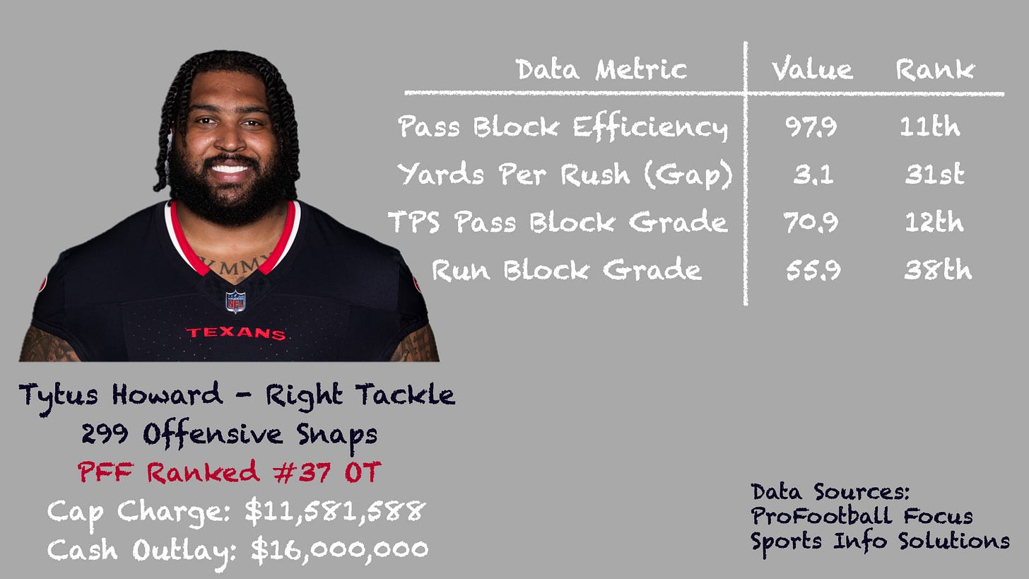 Now shifting over to right tackle (pun intended) the Houston Texans have 7th year veteran Tytus Howard. Howard has had a tulmuteous career in Houston marred by multiple positions across the offensive line over the past 6 seasons, including one game in 2025 at right guard.