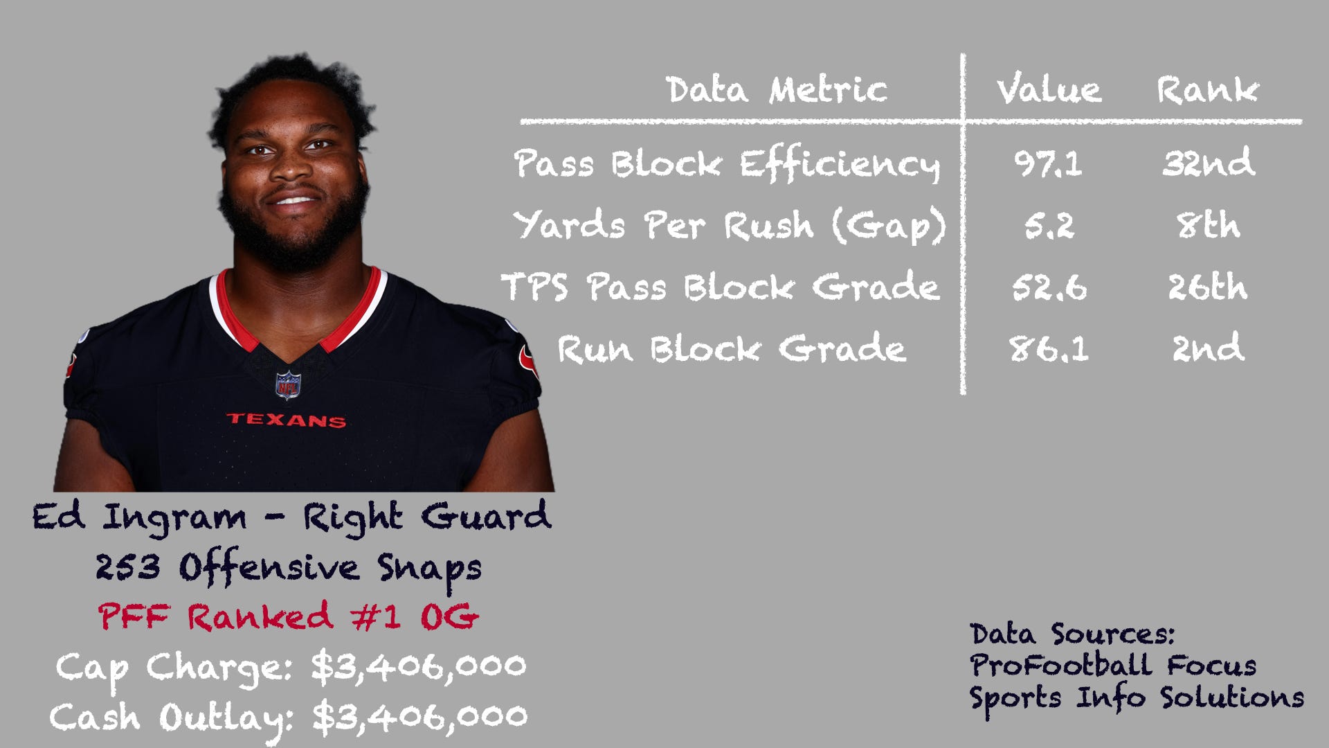 Ed Ingram has been one of the bright spots on the revamped offensive line 5 weeks into the season. Ingram was acquired via trade in March 2025 for a future 6th-round pick from the Minnesota Vikings. Coming from a zone-type scheme to Houston’s new power gap scheme has made Ingram the primary beneficiary. Houston was able to identify Ingram’s skill set as a player who would excel in Houston.