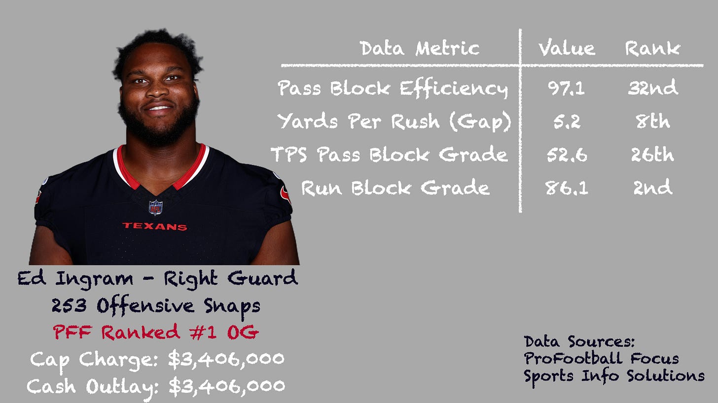 The league may not value Ingram as someone who should be paid as a top-tier offensive guard. Free agency is an unpredictable beast. During the 2025 free agency period, teams paid upper market value for Aaron Banks ($19.25m APY), Will Fries ($17.54m), Joe Thuney ($17.5m). Robert Hunt secured a $20.0m APY during the 2024 free agency period. Letting Ingram depart in free agency on the basis of compensatory pick acquisition should not be part of the equation. Houston will offset Ingram’s contract with other free agency signings in 2026.
