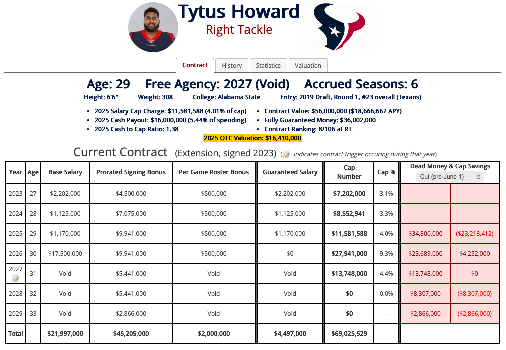 Extend Howard with a 2 or 3 year contract extension. With the market explosion at the offensive tackle position, and the salary cap leverage Howard would have; all creates a difficult situation for Houston. Howard would likely be looking for in excess of $20 million per year on a new deal. Houston has two factors in their favor: Howard turning 30 years of age, and Howard’s inconsistent play over the past few years. Perhaps a 2 year contract extension (3 years in total through 2028) worth $39.0 million in new money ($19.5 million APY) with $37.5 million in total guarantees would get the deal done. This contract would also create $12.0 million in cap space for 2026. Howard was due $18.0 million in 2026, this extension would give him a $4.0 million raise for the 2026 league year in terms of cash.
