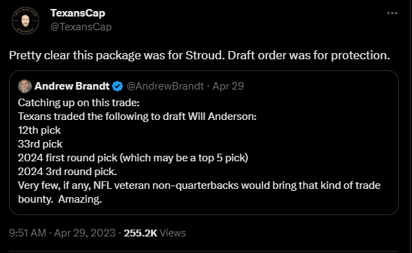 The question then becomes why did Houston have to trade so much after taking Stroud and eliminating Tennessee from the process? Nobody really knows the answer to that question absent a direct quote from Nick Caserio. But we can speculate.