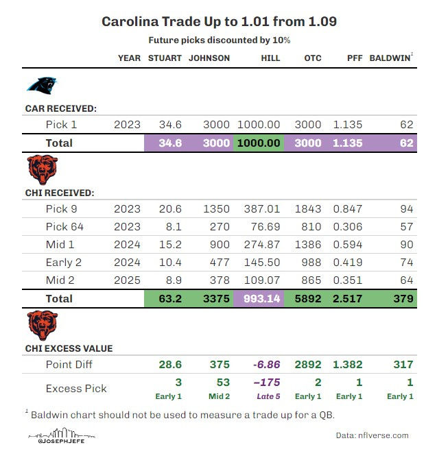 Majority of the charts list the excess value at Early 1st value. As it turned out, Carolina traded up to draft Quarterback Bryce Young.