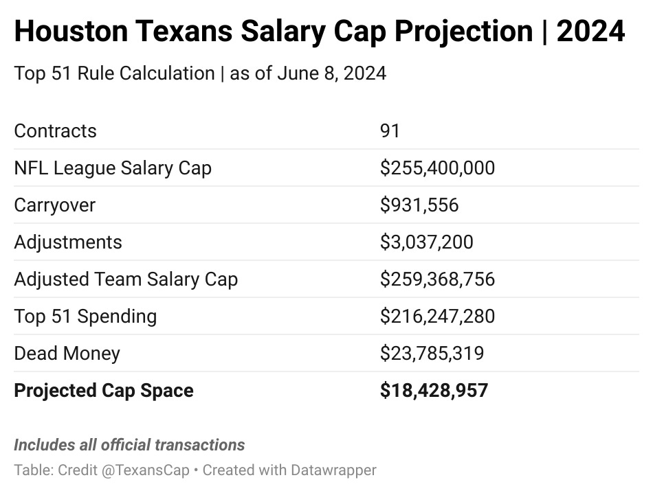 This is the latest version of the graphic I developed using Datawrapper. The graphic presented in the video below is slightly different however, the topics are nearly identical. This video would apply to any NFL team salary cap table.