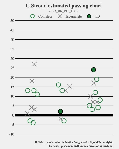 The one metric that stood out to me was a 0% turnover worthy attempt day. Stroud has yet to throw an interception this season, and has experienced a bit of luck along the way to maintain that status. Stroud did not have any close calls today. Worth noting FantasyPts. manual charting had Stroud with 3% turnover worth attempts.