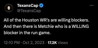 Houston put together a fantastic offensive scheme to cripple the Pittsburgh pass rush, a clear defensive scheme relying on the 4 man pass rush with multiple stunts. Stroud continues his confidence growth despite a reserve offensive line group. If Houston can get the running game moving efficiently fans might see something special.